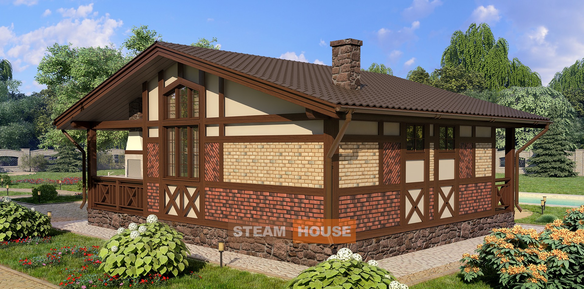 Представляем Вашему вниманию баню с нестандартным районированием внутреннего пространства. Главный упор в данном проекте был сделан на полуоткрытые пространства, которыми являются большая веранда и крыльцо. Подобное решение предоставило нам возможность добиться весьма интересного визуального эффекта – баня смотрится достаточно внушительно, но сохраняет доступную стоимость благодаря экономии на используемых материалах.