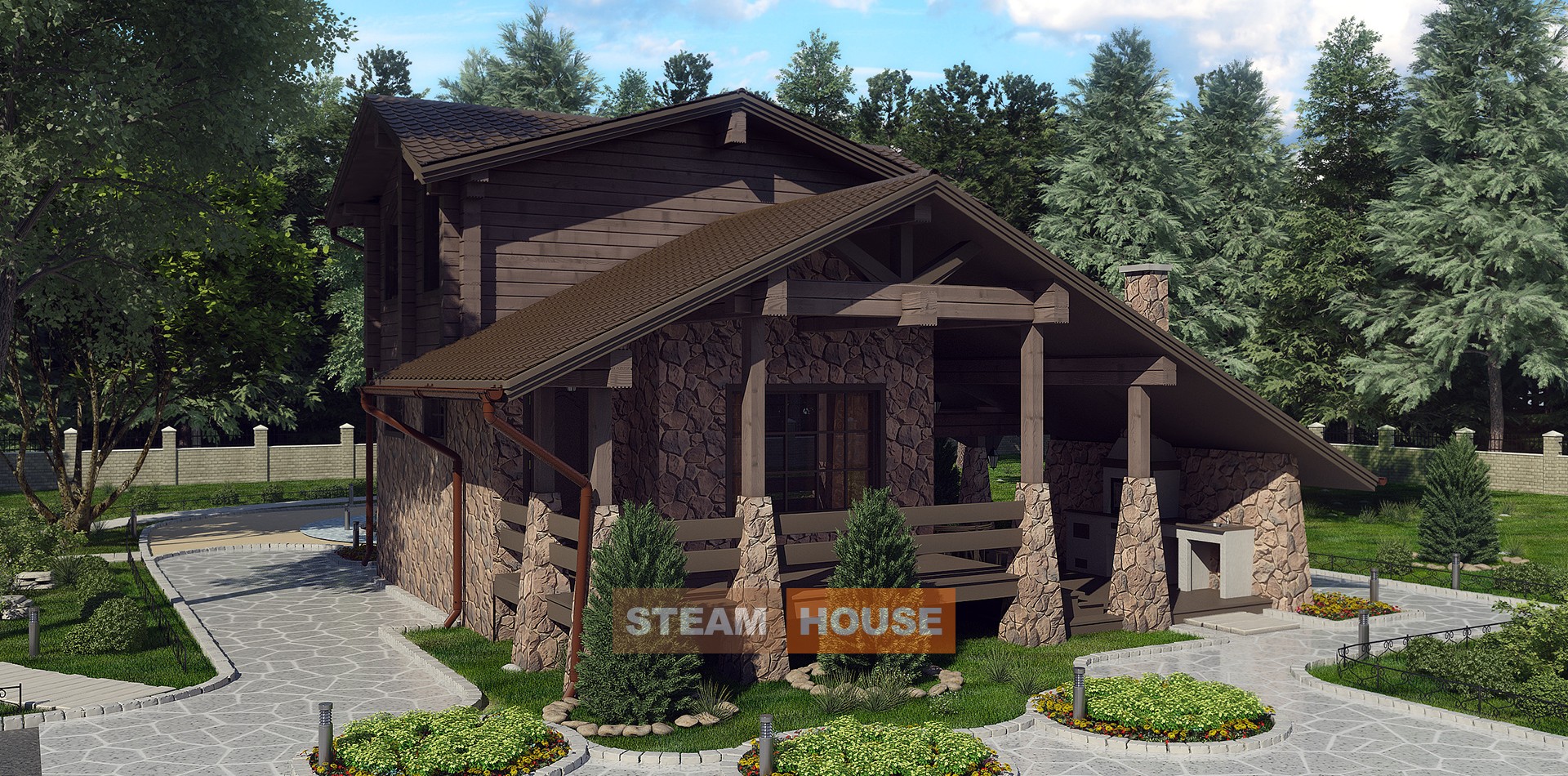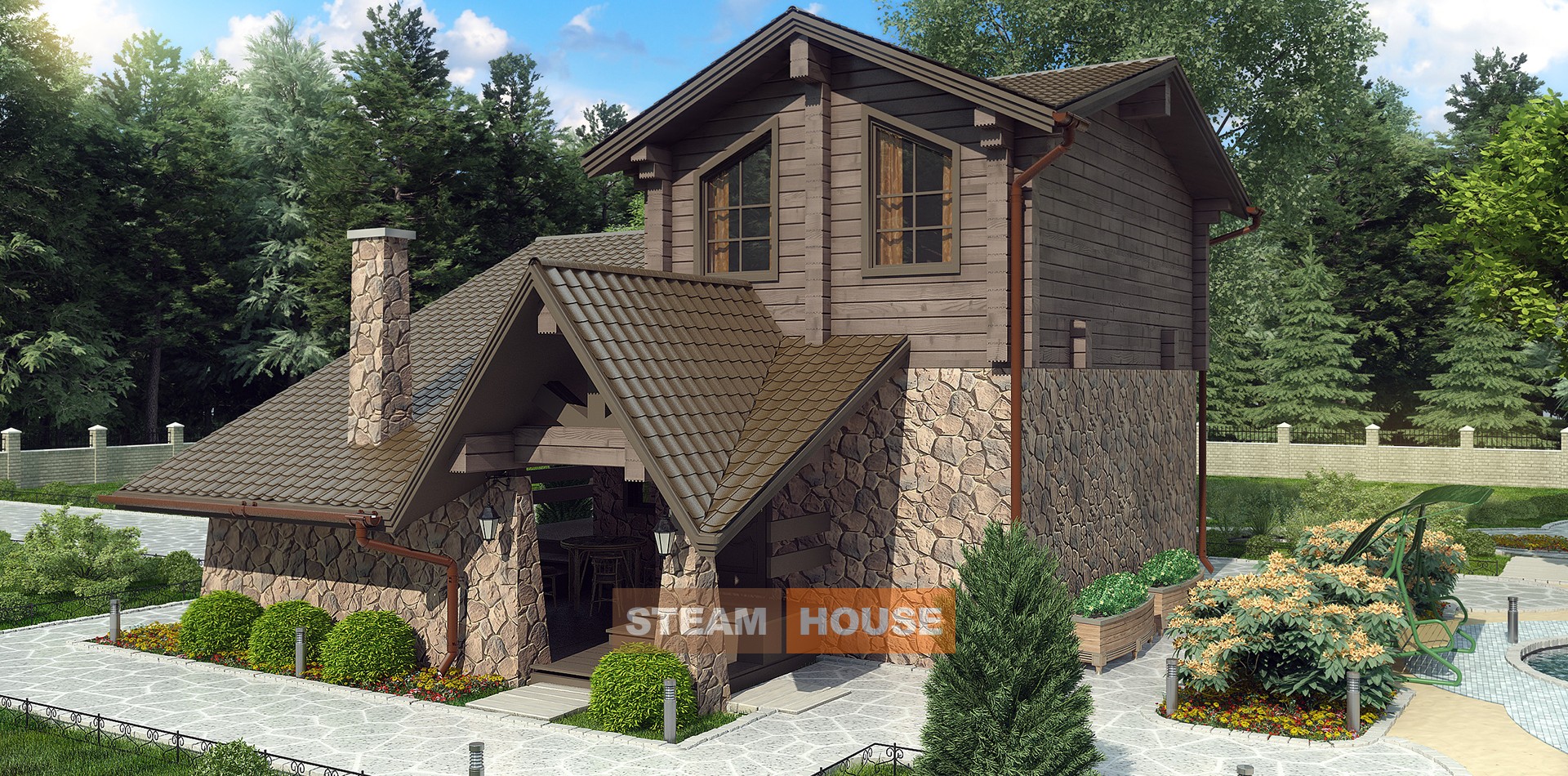 Так же как и классический проект «Metrona», баня «Metrona» stone выполнена в классическом европейском архитектурном стиле и дополнена большой открытой верандой. Благодаря комбинированию камня и дерева, баня будет отлично сочетаться, как с каменным так и с деревянным домом. Двухэтажное исполнение и форма отапливаемой части бани, близкая к квадрату, позволили добиться сочетания минимальных теплопотерь и максимальной полезной площади.