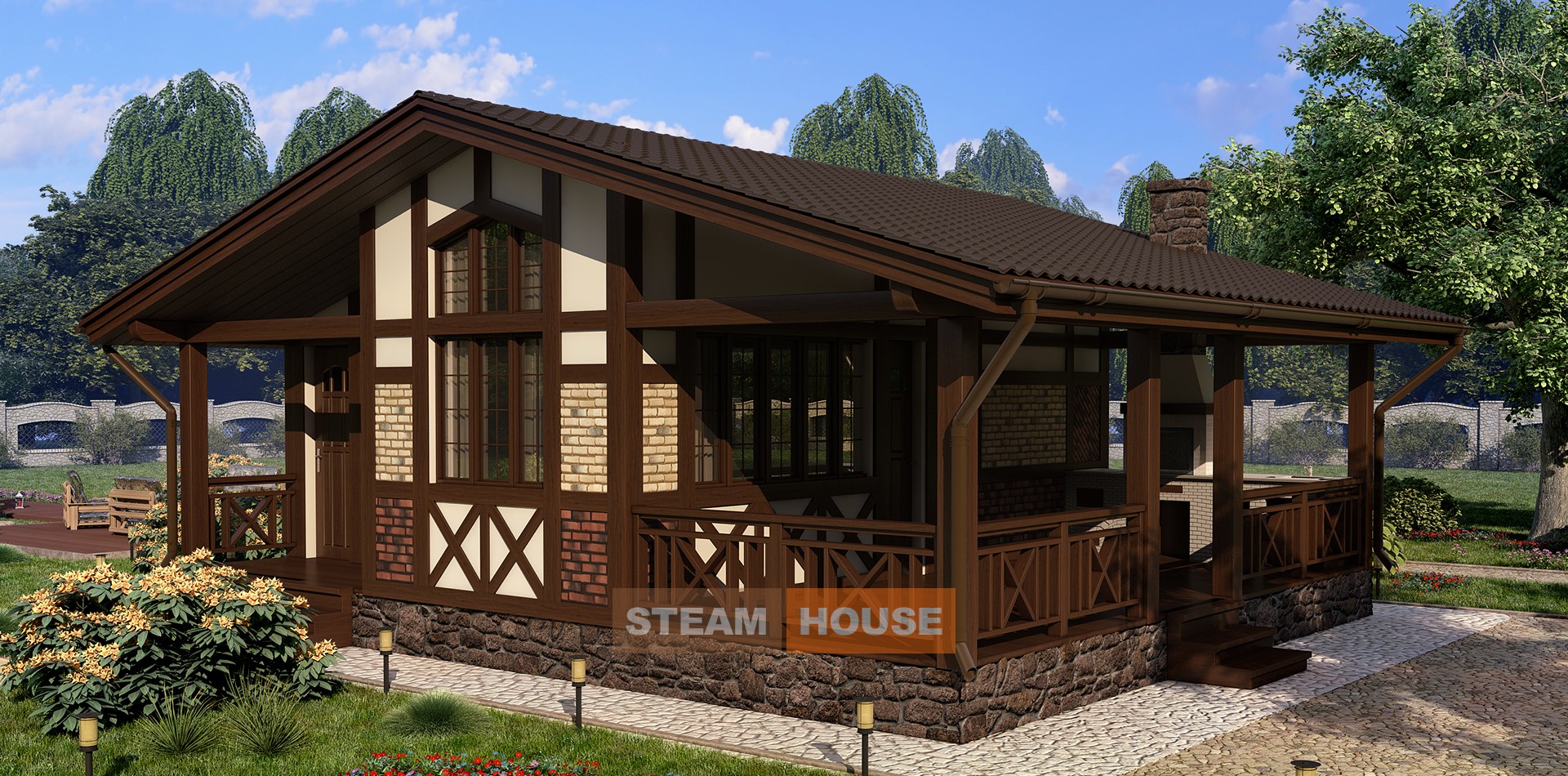 Представляем Вашему вниманию баню с нестандартным районированием внутреннего пространства. Главный упор в данном проекте был сделан на полуоткрытые пространства, которыми являются большая веранда и крыльцо. Подобное решение предоставило нам возможность добиться весьма интересного визуального эффекта – баня смотрится достаточно внушительно, но сохраняет доступную стоимость благодаря экономии на используемых материалах.